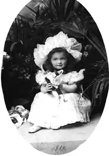 Olga was born on 15 November 1895. She was the oldest child and daughter of Emperor Nicholas II and Empress Alexandra. The birth was difficult, and Alexandra was in labor for 13 hours. Ultimately, Dr. Ott used forceps to deliver Olga.[20] She weighed 4.5 kg at birth, and she was so robust that Nicholas said that she didn't look like a newborn.[21] Her parents were overjoyed and insisted that they were not disappointed that their first child was not a boy. When he was congratulated by the court chamberlain, Nicholas declared, “I am glad that our child is a girl. Had it been a boy he would have belonged to the people, being a girl she belongs to us."[22] Alexandra agreed: “For us there is no question of sex. Our child is simply a gift from God."[23]