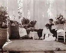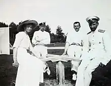Alexandra frequently reminded Olga to be a good example for her younger siblings and make sure that they behaved. In many letters, Alexandra told Olga "remember above all to always be a good example to the little ones"[36] and warned her that "you must have a positive influence over them."[37] Olga struggled to keep her siblings in line. Alexandra blamed sixteen-year-old Olga, who was sitting beside her seven-year-old brother, for failing to control the misbehaving Tsarevich Alexei during a family dinner. The spoiled Alexei teased others at the table, refused to sit up in his chair, wouldn't eat his food and licked his plate. The Tsarina's expectation was unreasonable, said Grand Duke Konstantin Konstantinovich of Russia, a distant cousin of the imperial family. "Olga cannot deal with him", he wrote in his diary on 18 March 1912.[38] Court official A. A. Mossolov wrote that Olga was already seventeen, but still "she had the ways of a flapper", referring to her rough manners and liking for exuberant play.[39]