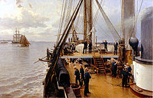On 2 December 1871, a ceremony took place at the National Academy of Design, where the Grand Duke was received by Samuel F. B. Morse, William Stoddard, William Page, Albert Bierstadt and several other artists. The painting Farragut in the shrouds of the Hartfort at the battle of Mobile Bay by William Page was handed over as a gift of the citizens of New York for Tsar Alexander II. General John Adams Dix presented the picture and the accompanying scroll, with a brief address in which he expressed the hope that it would further cement the union that existed between the United States and Russia. The painting was placed on board the Russian flagship for transportation to Russia.[30]