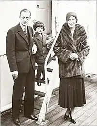 In 1923 Grand Duchess Maria Pavlovna divorced her second husband and bought a small house at Boulogne-sur-Seine and Dimitri moved with her to the top floor.[33] As he worked at Reims for the champagne company, he was out most of the day but spent the evening with his sister.[33] Invited to a tea party at Versailles with his sister, he met Audrey Emery, a sophisticated and attractive American heiress. Her father was a self-made millionaire and after his death, his mother had married a son of the second Earl of Lichfield.[41] Grand Duke Dmitri had no fortune to offer, but they fell in love and they were married in the Orthodox Church at Biarritz on 21 November 1926.[41] It was a morganatic marriage, and Audrey, who converted to Russian Orthodoxy and took the name Anna Ioannovna in baptism, was granted the title Her Serene Highness, Princess Romanovskaya-Ilyinskaya by his cousin, Grand Duke Kyril. They spent their honeymoon in England where they established their first home.[41] The couple's only child, Paul Romanovsky-Ilyinsky, was born in London in 1928.[41] Paul grew up in France, Britain, and the United States; he served as a US Marine in the Korean War. In 1989, he was elected Mayor of Palm Beach, Florida, and thus became the only Romanov descendant known to have held elected public office. Following the fall of communist Russia in 1991, a delegation of Russian royalists approached him and asked him to assume the title of Tsar, which he declined.[42]