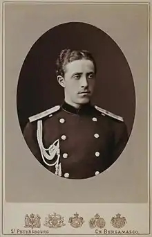 A very tall man (1.98m / 6' 6"), Nicholas, named after his paternal grandfather, the emperor, was born as the eldest son to Grand Duke Nicholas Nicolaevich of Russia (1831–1891) and Alexandra Petrovna of Oldenburg (1838–1900) on 18 November 1856.[4] His father was the sixth child and third son born to Nicholas I of Russia and his Empress consort Alexandra Fedorovna of Prussia (1798–1860). Alexandra Fedorovna was a daughter of Frederick William III of Prussia and Louise of Mecklenburg-Strelitz.[5]