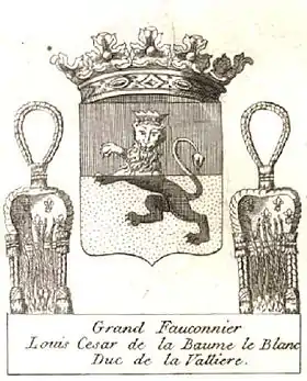 The coat of arms of the Grand Falconer featured two lures in blue and fleur-de-lys, placed below and to each side of the shield.