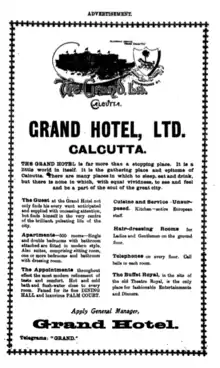 The site where the hotel now stands was first developed at No. 13 Chowringhee Road as the private residence of a Colonel Grand in the early nineteenth century. The house was converted into a boarding house by Mrs. Annie Monk who later expanded her business to include Numbers 14, 15 and 17. 16 Chowringhee was occupied by a theatre owned and managed by Arathoon Stephen, an Armenian from Isfahan. When, in 1911, the theatre burned down, Stephen bought out Mrs. Monk and, over time, redeveloped the site into what now makes up the modern hotel.[1] Built in an extravagant neoclassical style, the hotel soon became a popular spot amongst the English population of Calcutta. It was known, in particular, for its annual New Year party that, along with iced champagne and expensive gifts, involved the release of twelve piglets in the ballroom. Anyone who caught a piglet, could keep it.[1]
