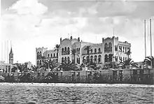 The Original hotel stands in an extensive open park which overlooks the then unfilled Tripoli harbor, not far from the Algerian embassy and Tripoli Cathedral - Jamal Abdul Nasser Mosque. It has 350 rooms.[2] It is noted for its many arches, inspired by the original building's facade, which form the basis of the structure. The hotel once had a propaganda poster on the outside of the hotel that showed a crying child superimposed above a montage of the wreckage caused by the attack by the British.[3]