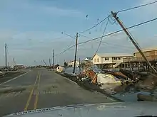 Hurricane Katrina pounded Grand Isle for two days, August 28–29, 2005, destroying or damaging homes and camps along the entire island. Katrina's surge reached 5 ft (1.5 m) at Grand Isle. Large waves severely damaged the only bridge linking Grand Isle to the mainland.[5] A news report published less than two days after the hurricane hit falsely noted, however, that the area had been completely destroyed, reporting a scenario similar to that which befell Last Island in 1856.[6] Less than a month later, Grand Isle was further affected by Hurricane Rita. By mid October, a number of businesses were again open on the island.
