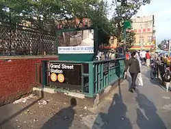 There are three staircase exits: two going up to the northeastern corner of the intersection of Grand and Chrystie Streets, and one going up to the northwestern corner.[16] The station originally only had the two street stairs to the northeastern corner of the intersection, but due to growing ridership over the years—mainly by commuters from various Brooklyn neighborhoods to Manhattan's Chinatown—the third staircase to the northwestern corner was added in 1999.[19]