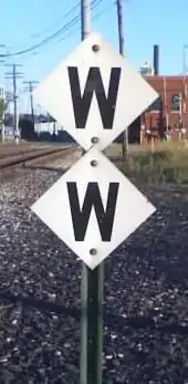 The whistle post sign style of GTW on a double whistle post at Battle Creek, Michigan