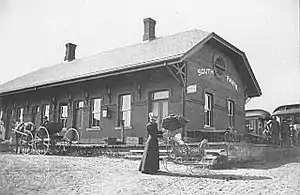 The Grand Trunk station was a historic railroad station in South Paris, Maine. The station was built in 1883 by the Grand Trunk Railroad linking South Paris with Montreal and Portland, Maine.[1] Trains began regular operation between Portland and the depot on the Paris side of the town line with Oxford at Widow Merrill's crossing October 8, 1849, even though the station was listed as "North Oxford" in timetables. The first train into South Paris village was a contractor's engine called the Jenny Lind on January 1, 1850. It ran carefully across temporary bridgework up to where the station was being built, as a means of satisfying the investors worries from Paris Hill to counter their threat of withdrawing their support and money if there was not a train in the village proper on that date (an engine operating by itself without cars met the ruling of a train). The Androscoggin bridge was completed March 15, 1850, with regular service to Portland from the present day station grounds to Portland beginning on the 18th. On December 30, 1879, the Norway Branch Railroad opened, running from Norway village on a line 1.45 miles long to connect with the Grand Trunk Railroad at South Paris.[2]