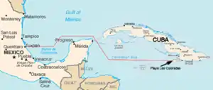 Shortly after midnight on 25 November 1956 in the Mexican port of Tuxpan, Veracruz, Granma was surreptitiously boarded by 82 members of the 26th of July movement including their leader, Fidel Castro, his brother, Raúl Castro, Che Guevara, and Camilo Cienfuegos. The group—who later came to be known collectively as los expedicionarios del yate Granma (the Granma yacht expeditioners)—then set out from Tuxpan at 2 a.m.[8] After a series of vicissitudes and misadventures, including diminishing supplies, sea-sickness, and the near-foundering of their heavily laden and leaking craft, they disembarked on 2 December on the Playa Las Coloradas, municipality of Niquero, in modern Granma Province (after the vessel), formerly part of the larger Oriente Province. Granma was piloted by Norberto Collado Abreu, a World War II Cuban Navy veteran and ally of Castro.[9] The location was chosen to emulate the voyage of national hero José Martí, who had landed in the same region 61 years earlier during the wars of independence from Spanish colonial rule.