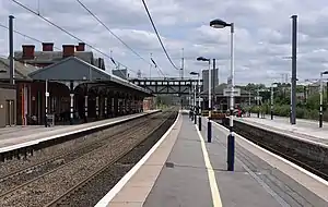 In 1937, the LNER announced that they planned to lengthen the down platform. At 800 feet (240 m) long it was too short to accommodate the increasing length of the main line express trains, and the work would extend it to 950 feet (290 m).[8] At the same time the whole platform length was to be raised to a standard height of 3 feet (0.91 m) and a new awning over the platform opposite the station buildings would be added.