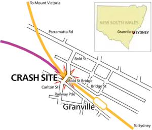 The Granville rail/train disaster occurred on Tuesday 18 January 1977 at Granville, New South Wales, a western suburb of Sydney, when a crowded commuter train derailed, running into the supports of a road bridge that collapsed onto two of the train's passenger carriages. The official enquiry found the primary cause of the crash to be poor fastening of the track.