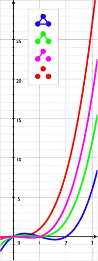 The chromatic polynomial counts the number of ways a graph can be colored using no more than a given number of colors. For example, using three colors, the graph in the adjacent image can be colored in 12 ways. With only two colors, it cannot be colored at all. With four colors, it can be colored in 24 + 4⋅12 = 72 ways: using all four colors, there are 4! = 24 valid colorings (every assignment of four colors to any 4-vertex graph is a proper coloring); and for every choice of three of the four colors, there are 12 valid 3-colorings. So, for the graph in the example, a table of the number of valid colorings would start like this: