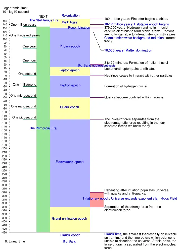- "Timeline of the Big Bang - The Big Bang and the Big Crunch - The Physics of the Universe". www.physicsoftheuniverse.com. Retrieved 2018-05-17.
