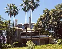 The property was next purchased by Thomas Allwright Dibbs, the manager of the Commercial Banking Company of Sydney. He had been buying up many parcels of land on the North Shore. By 1882 Graythwaite was the family home of Thomas Dibbs and in 1888 the mortgage of 1882 was discharged. Dibbs, c. 1875, demolished Walker's house and added to the Sayers sandstone building to complete Euroka / Graythwaite as it remains today. Dibbs was a huge landowner on the lower north shore and bought the adjoining Holtermann property when Holtermann died and later sold it to the church for Shore School. Apparently Holtermann closely guarded access to his tower and so many of the early photographic panoramas of Sydney were taken from Graythwaite instead. Most of the current garden dates from Dibbs c. 1875 (the fig trees can be seen as little trees protected by wooden frames from wandering stock in the 1875 photos). The garden includes a pepper berry/ white walnut (Cryptocarya obovata), a very rare rainforest species, native to northern NSW rainforests and once native to the Illawarra (apparently extinct in that district since the mid 1800s). Only one other specimen of it is known in Sydney, in Prince Alfred Park. Both may owe their presence to associations with colonial botanists James Backhouse and Allan Cunningham (who recorded the species in the Illawarra in c. 1811), and then-director of the Botanic Gardens, Sydney, Charles Moore, who did much to promote the planting of NSW and Queensland rainforest tree species on public sites.[2][1]