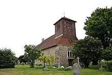 The parish church of St John & St Giles is a Grade II* listed building.[5] It is Norman in design and was built on the site of an earlier Saxon church. It contains Roman bricks, along with many of the houses in the village. It has had many alterations, and at one time was cruciform, but the north and south transepts have disappeared, and only thickened walls indicate the position of the crossing tower. By 1460 the tower had disappeared, and the three bells that were in use were housed in a timber cupola over the west end of the nave. But this was demolished in 1899 during a major refurbishment, and a large timber tower was built, far taller than the current low brick tower installed in 1928. It was struck by lightning, and its ancient timber was installed into many of the old Tudor houses, including the 'King Post' of the tower installed into Essex House, with a plaque reading 'KING POST of Old Wooden Tower, GREAT EASTON CHURCH, erected 1777, Demolished 1928.' This makes the post at least 235 years old, but this is only half as old as most of the houses surrounding the church.