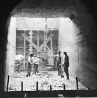Throughout the 19th century, entrepreneur after entrepreneur attempted to harness the extraordinary hydro power potential of the Caney Fork only to be defeated by one of the volatile river's disastrous floods. The first major establishment to utilize the river's power at Great Falls was the Bosson Mill, a gristmill and carding factory that operated at the site across the river from the Power House from the 1860s until its destruction by a flood in 1882.[5] The most prominent venture at Great Falls Gorge was the Falls City Cotton Mill Company, which established a cotton mill and company town, Falls City, just above the gorge in 1892. The company turned a moderate profit until 1902, when the Good Friday Flood destroyed its toll bridge and powerhouse, and the mill was forced to close (the mill and the town's "spring castle" are still standing, however).[6]
