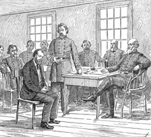 On March 20, the recently released raiders arrived in Washington DC, and the following day Pittenger wrote a letter to Secretary of War Edwin M. Stanton detailing their mission to Georgia.[16] On March 24, they were interviewed by Judge Advocate General Joseph Holt, who was able to corroborate details of their mission with testimony from the raiders who had escaped in 1862.[17] On March 25, they were invited to Stanton's office at the Department of War. After a brief conversation, Stanton announced that the raiders would receive the newly approved Medal of Honor. Private Jacob Parrott, who had been physically abused as a prisoner, was awarded the first. The others were Sergeant Elihu H. Mason, Corporals William Pittinger and William H. H. Reddick, and Privates William Bensinger and Robert Buffum. Stanton also offered them all commissions as First Lieutenants.[18] After the ceremony the six raiders were taken to the White House to meet President Abraham Lincoln, which became a tradition for all Medal of Honor recipients.[19] Later, all but three of the other soldiers who had participated in the raid also received the Medal of Honor, with posthumous awards to families for those who had been executed. As civilians, Andrews and Campbell were not eligible. In 2008, the House of Representatives passed a bill which would retroactively award the Medal of Honor to two of the three remaining raiders, Charles Perry Shadrack and George Davenport Wilson.[20] However, as of 2020 it has not been acted upon. All the Medals of Honor presented to the Andrews Raiders used identical text.