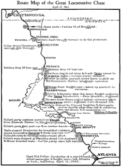 The Great Locomotive Chase (also known as the Andrews' Raid or Mitchel Raid) was a military raid that occurred April 12, 1862, in northern Georgia during the American Civil War. Volunteers from the Union Army, led by civilian scout James J. Andrews, commandeered a train, The General, and took it northward toward Chattanooga, Tennessee, doing as much damage as possible to the vital Western and Atlantic Railroad (W&A) line from Atlanta to Chattanooga as they went. They were pursued by Confederate forces at first on foot, and later on a succession of locomotives, including The Texas, for 87 miles (140 km).
