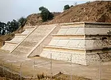 Building A is the earliest version of the pyramid also called "La Conejera."[18] This structure was discovered in the 1950s, near the end of the first round of excavations. It is a pre-Teotihuacan structure, relatively simple with an adobe core.[18][35] However, it was not found directly under the other layers of the Pyramid, but rather under a structure known as the Edificio Rojo (Red Building) in the northeast corner. This makes the oldest pyramid of the site "off-center" in relation to the later pyramids. It was built with an adobe core with a base of about ten meters square. It has a wall in talud topped with a 57 cm cornice. Over this, a two-story chamber faced south. One side of La Conejera, eight rounded steps made of earth with a stone core lead to the west side of the structure, into a hallway. This bears some resemblance to the rounded pyramid of Cuicuilco. From the ceramics found with it, the structure has been dated to about 200 BC, contemporary with sites such as Zacatenco and El Arbolillo in the Valley of Mexico. La Conejera's base, cornice and chamber were all painted. Black paint remains on the base. The cornice on the northwest corner had white squares painted over a black background. Investigators have assumed that this pattern was repeated over the rest of the cornice. Both the outer and inner walls of the chamber were painted red several times with no designs.[35][36]