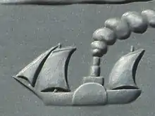 In his 2001 book, Maritime Tragedies on the Santa Barbara Channel, Justin Ruhge suggested that, "When Major Garnett laid out the seal, he included a number of sailing ships and on the middle left side of the seal he also drew in a steam bark. It is likely that this is the U.S.S. Edith. The ship in the drawing is a steamer without side wheels. At that time only the U.S.S. Edith was such a ship. The only other steamer on the west coast at that time was the much larger steamer California that was driven by side wheels."[38] The USS Edith, a screw steamer, was sent from San Francisco Bay to Santa Barbara and San Diego in August 1849 to pick up the delegates for the upcoming constitutional convention. On the second day out, the Edith ran aground in a heavy fog at about 10 p.m. south of Point Sal, at the north end of what would become Vandenberg Air Force Base. There was no loss of life and the captain and crew were later exonerated by a Court of Inquiry, but the ship and her cargo had to be abandoned. Garnett, a passenger, was left in charge of the salvage efforts. Sam Pollard reported that "a few days after the wreck [Garnett] came to San Luis Obispo and was my guest for two weeks ... and showed me the work he was doing on [the State Seal] in my store at San Luis Obispo." Leidesdorff's Sitka was a sidewheeler as well.[39]
