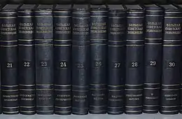 There were three editions. The first edition of 65 volumes (65,000 entries, plus a supplementary volume about the Soviet Union) was published during 1926–1947, the chief editor being Otto Schmidt (until 1941). The second edition of 50 volumes (100,000 entries, plus a supplementary volume) was published in 1950–1958; chief editors: Sergei Vavilov (until 1951) and Boris Vvedensky (until 1969); two index volumes to this edition were published in 1960. The third edition of 1969–1978 contains 30 volumes (100,000 entries, plus an index volume issued in 1981). Volume 24 is in two books, one being a full-sized book about the USSR, all with about 21 million words,[3] and the chief editor being Alexander Prokhorov (since 1969). In the third edition, much attention was paid to the philosophical problems of natural sciences, physical and chemical sciences, and mathematical methods in various branches of knowledge.[4]
