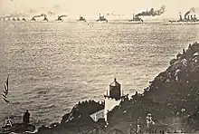 Additionally, the voyage of the Great White Fleet demonstrated both at home and on the world stage that the U.S. had become a major sea power in the years after its triumph in the Spanish–American War, with possessions that included Guam, the Philippines, and Puerto Rico.[5] This was not the first demonstration of naval power however; during the Algeciras Conference in 1906, which was convened to settle a diplomatic crisis between France and Germany over the fate of Morocco, Roosevelt had ordered eight battleships to maintain a presence in the Mediterranean Sea.[6] Since Japan had arisen as a major sea power with the 1905 annihilation of the Russian fleet at Tsushima, the deployment of the Great White Fleet was therefore intended, at least in part, to send a message to Tokyo that the American fleet could be deployed anywhere, even from its Atlantic ports, and would be able to defend American interests in the Philippines and the Pacific.[7][8]