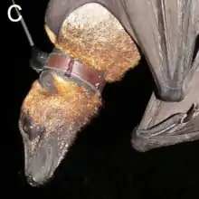 The great flying fox is the largest bat on the island New Guinea,[10] as well as the whole of Melanesia.[11] Its forearm length ranges from 165–207 mm (6.5–8.1 in),[12] and individuals can weigh up to 1.6 kg (3.5 lb).[3] This makes it one of the heaviest known species of bat.[13] Males are typically larger than females. Males have a head and body length of 266–330 mm (10.5–13.0 in), while females are 234–280 mm (9.2–11.0 in) long. Forearm lengths are 190–207 mm (7.5–8.1 in) and 165–173 mm (6.5–6.8 in) for males and females, respectively.[3] Males also have conspicuously larger canine teeth than females.[7] It lacks a tail,[3] and has a long, narrow snout relative to the black-bearded flying fox.[14] The subspecies P. n. hilli is smaller than P. n. neohibernicus.[5]