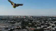 The great kiskadee is a common, noisy and conspicuous bird. It is almost omnivorous and hunts like a shrike or flycatcher, waiting on an open perch high in a tree to sally out and catch insects in flight or to pounce upon rodents and similar small vertebrates. It will also take prey and some fruit[20] from vegetation by gleaning and jumping for it or ripping it off in mid-hover, and occasionally dives for fish or tadpoles in shallow water, making it one of the few fishing passerines. Kiskadees like to hunt on their own or in pairs, and though they might be expected to make good use of prey flushed by but too large for the smaller birds of the understory, they do not seem to join mixed-species feeding flocks very often. When they do, they hunt in the familiar manner. Such opportunistic feeding behavior makes it one of the commonest birds in urban areas around Latin America; its flashy belly and its shrill call make it one of the most conspicuous.[21]