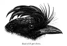 In 1760 the French zoologist Mathurin Jacques Brisson included a description of the greater racket-tailed drongo in his Ornithologie based on a specimen that had been collected in Thailand (Siam). He used the French name Le Coucou Verd Hupé de Siam and the Latin Cuculus Siamensis Cristatus Viridis.[3] Although Brisson coined Latin names, these do not conform to the binomial system and are not recognised by the International Commission on Zoological Nomenclature.[4] When in 1766 the Swedish naturalist Carl Linnaeus updated his Systema Naturae for the twelfth edition, he added 240 species that had been previously described by Brisson.[4] One of these was the greater racket-tailed drongo. Linnaeus included a brief description, coined the binomial name Cuculus paradiseus and cited Brisson's work.[5] The current genus Dicrurus was introduced by the French ornithologist Louis Pierre Vieillot in 1816.[6]