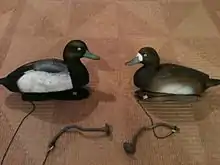 Greater scaup are a popular game bird in North America and Europe.[36] They are hunted in Denmark, Germany, Greece, France, the United Kingdom, and Ireland,[36] and in Iran for both sport and commercial reasons.[19] Greater scaup are hunted with shotguns because they must be shot on the fly, a challenging task, as they can fly at up to 121 km/h (75 mph). Greater scaup are hunted from shorelines and in open water hunting blinds or layout boats, low-profile kayak-like boats that hunters lie inside. Hunters frequently use decoys to attract the birds, often arranged to simulate a raft of greater scaup and featuring an open area to attract the birds to land.[37] In most countries where greater scaup are hunted, a duck stamp is required along with the normal hunting licences that are required to pursue other game. In America and Canada, waterfowl must be hunted with non-toxic shot.