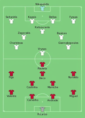 Line-ups for the Euro 2004 Final, where Greece defeated hosts Portugal 1–0.