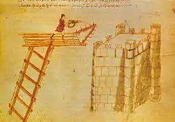 The chief method of deployment of Greek fire, which sets it apart from similar substances, was its projection through a tube (siphōn), for use aboard ships or in sieges. Portable projectors (cheirosiphōnes, χειροσίφωνες) were also invented, reputedly by Emperor Leo VI. The Byzantine military manuals also mention that jars (chytrai or tzykalia) filled with Greek fire and caltrops wrapped with tow and soaked in the substance were thrown by catapults, while pivoting cranes (gerania) were employed to pour it upon enemy ships.[71][72] The cheirosiphōnes especially were prescribed for use at land and in sieges, both against siege machines and against defenders on the walls, by several 10th-century military authors, and their use is depicted in the Poliorcetica of Hero of Byzantium.[73][74] The Byzantine dromons usually had a siphōn installed on their prow under the forecastle, but additional devices could also on occasion be placed elsewhere on the ship. Thus in 941, when the Byzantines were facing the vastly more numerous Rus' fleet, siphōns were placed also amidships and even astern.[75]