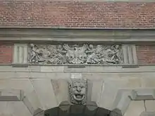 With the Golden Gate and the Highland Gate, the Green Gate spans the Long Market and Long Street, together comprising the Royal Route. The Green Gate was clearly inspired by the Antwerp City Hall.[1] It was built 1568-71 as the formal residence of Poland's monarchs.[2] It is a masterpiece by Regnier (or Reiner van Amsterdam), an Amsterdam architect,[3] and reflects Flemish architectural influence in Gdańsk. Hans Kramer from Dresden was responsible for the construction plans.