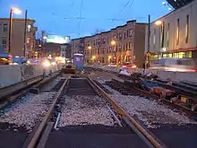 Although the planned road widening never occurred, the MBTA ultimately reconstructed the line for use by the new LRVs as part of other road and sewer work on Huntington Avenue.[97] The MBTA work largely followed the plans proposed in the 1960s; the Northeastern footbridge was not included. The three previously-proposed stops were cut along with Parker Street; the remaining stops at Brigham Circle, Longwood Medical Area, Museum-Ruggles, and Northeastern were rebuilt with wider and longer platforms. On March 21, 1980, service was cut back to a Symphony–Park Street shuttle (run by LRVs) to allow for construction, with route 39 buses again operating.[98][48] The shuttle was extended to Northeastern on June 21 and Brigham Circle on September 20.[48] Symphony was closed on January 3, 1981 during a budget crisis.[99][48] Service restoration on the outer section of the line, originally scheduled for 1981, was delayed by the budget issues.[98][100] Arborway service ultimately resumed on June 26, 1982, including peak-hour Heath Street short turns and the reopening of Symphony.[48][101][102]