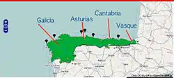 The region includes nearly all of Galicia, Asturias, and Cantabria, in addition to the northern parts of the Basque Country, as well as a small portion of Navarre.