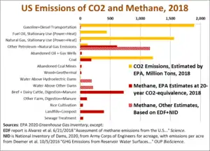 After carbon dioxide, the next most abundant compound is methane, though there have been methodological differences in how to measure its effects. According to a 2016 study, US methane emissions were underestimated by the EPA for at least a decade, by some 30 to 50 percent.[8] Currently, the US government is working to reduce methane emissions in the agriculture, mining, landfill, and petroleum industries.[9]