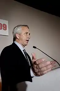 In 2001 LeMond was one of the first professional cyclists of note, and the only former Tour champion, to openly express doubts over the legitimacy of Lance Armstrong's three-consecutive Tour successes.[5][6][7] He consistently questioned the relationship between riders and sports doctors like Italian Michele Ferrari. In 2006 LeMond noted that the extent of doping in the sport could not occur without complicity from the body that regulates international professional cycling, and he accused the Union Cycliste Internationale of serious doping-related corruption.[8][9] In an open letter in December 2012 he asserted that UCI's Pat McQuaid and Hein Verbruggen were central to the problem in professional cycling.[10] LeMond claimed professional cyclists are treated as "lab rats," while the doping facilitators escape harm or responsibility. He told an audience at Coventry University, "The doctors, the management, the officials, they're the ones that have corrupted riders. The riders are the only ones that pay the price".[8] LeMond's statements have brought him into conflict with some of the sport's elite, including the UCI's McQuaid and Verbruggen, the Trek Bicycle Corporation,[11] and riders Lance Armstrong,[12] Floyd Landis, and Alberto Contador. In the interests of reforming the sport, LeMond offered to serve as president of the UCI, taking over the position of former president Pat McQuaid.[13][14]