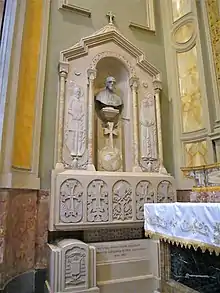 Agagianian died of cancer in Rome on May 16, 1971.[66][4] Pope Paul VI called him a "noble figure" upon Agagianian's death.[67] Vazgen I, head of the Armenian Apostolic Church, sent Pope Paul VI a letter mourning Agagianian's death.[68] His funeral took place on May 21 at St. Peter's Basilica.[3] He was buried in Rome's San Nicola da Tolentino Armenian church. There is a monument to Agagianian inside the church, flanked by the virgin martyr Hripsime and St. Vartan.[69]