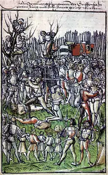 In May 1444, during the Old Zürich War, the Old Swiss Confederacy laid siege to Greifensee which was held by about 70 defenders, most of them inhabitants of the Amt Greifensee with a few Habsburg and Zürich soldiers. The town was captured after four weeks, on May 27, and all but two of the surviving 64 defenders were beheaded on the next day, including the leader, Wildhans von Breitenlandenberg. Breitenlandenberg's body was brought to his family, the bodies of the other surrenders were buried at the Uster church. Even in times of war, mass execution was widely considered a cruel and unjust deed. On May 29, the Castle of Greifensee and the city walls were broken.