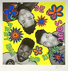 In an essay written to accompany the exhibition, Mott describes the process of designing the album cover: "De La Soul visit our loft where we lay them down on the floor facing up, their heads making a triangle. We photograph them whilst hanging precariously off a step ladder, one idea being that the cover would not have a right way up. CD's [sic] have yet to be the dominant musical format so the vinyl album sleeve is our most effective way of making a statement [...] The intent of the design of De La Soul's, 3 Feet High and Rising LP cover is to be new and bright, with the overlaying of the fluorescent flowers and text reflecting a synthetic pop cartoon look [...] This is a move away from the prevailing macho hip hop visual codes which dominate to this day".