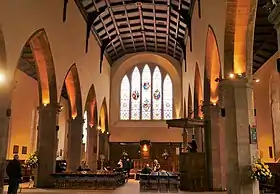 Internally, octagonal pillars bear parallel arcades of chamfered pointed arches that run along eight bays; these are interrupted only by a lateral arch that divides the western two bays from the rest of the church. The aisles of these bays are partitioned off to form rooms and the arch frames the organ loft.[37] In these two western bays, a plaster vault forms the ceiling while the eastern six bays are covered by a timber barrelled ceiling supported on timber shafts that rise from corbels in the wall above each pillar.[55] A boss rests where each arch between corresponding shafts crosses the longitudinal rib; these depict emblems of Saint Andrew, Saint Margaret, and each person of the Trinity.[56][58][59]