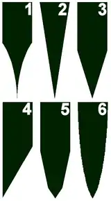 - Double bevel or compound bevel — A back bevel, similar to a sabre or flat grind, is put on the blade behind the edge bevel (the bevel which is the foremost cutting surface). This back bevel keeps the section of blade behind the edge thinner, which improves cutting ability. Being less acute at the edge than a single-bevel grind, it sacrifices sharpness for resilience: such a grind is much less prone to chipping or rolling than a single-bevel blade. This profile is commonly found in Japanese swords, such as the familiar katana. The shape of the bevel is much more efficient in reducing drag than the sabre grind typically found on Western sword blades. In practice, double bevels are common in a variety of edge angles and back bevel angles, and Western kitchen knives generally have a double bevel, with an edge angle of 14–16° (included angle of 28–32°) and a maximum of 40° as specified by International standard ISO 8442.1 (knives for the preparation of food).