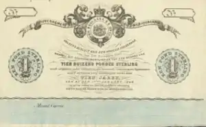 In 1867, after the Bank of Durban had begun printing its own banknotes, Kok and his followers embarked on a similar experiment of their own and had about 10,000 one pound-notes printed for use in the area.[18] The plans to actually introduce them never materialised, and, with the exception of a few remaining samples, almost all of them were destroyed without ever being in circulation.[18][19]