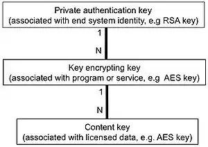 The group state that is stored in the group member are keys and key metadata. Conceptually, the group member's keys are structured in a set of 1:N relationships and often called a "key ladder". The member has a credential such as an X.509 certificate that proves it is authorized to join one or more groups. The default group policy for the "Private Authentication Key" is a 2048-bit RSA key, but other policies are possible. Similarly, the default "group key" or "Key Encrypting Key" is a 128-bit AES key, but other policies are possible. Finally, the data encryption key is application-dependent but is commonly a 128-bit AES key. In some groups, a member can be a sender that generates a data encryption key and encrypts it with the key encrypting key. So long as the two share the group key for the same group, the sender can use that "key encrypting key" to encrypt the key(s) for the media files or streams that it serves.