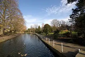 The cascade is near the footbridge towards the Stone Court corner of the park. The 1.5m fall is now ornamental in design and was reconstructed in the 1960s.[7] The original purpose was to create a head of water to power Upper Mill, which is nearby.