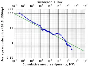 - J. Doyne Farmer, François Lafond (2 November 2015). "How predictable is technological progress?". Research Policy. 45 (3): 647–665. arXiv:1502.05274. doi:10.1016/j.respol.2015.11.001. S2CID 154564641. License: cc. Note: Appendix F. A trend extrapolation of solar energy capacity.