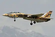 Following the US Navy's retirement of its Tomcats in 2006, Iran sought to purchase spare parts for its aircraft.[81] In January 2007, the U.S. Department of Defense announced that sales of spare F-14 parts would be suspended over concerns of the parts ending up in Iran.[82] In July 2007, the remaining American F-14s were shredded to ensure that any parts could not be acquired.[66] Despite these measures, Iran managed to significantly increase its stocks of spare parts, increasing the number of airworthy Tomcats, although as it did not manage to obtain spare parts for the aircraft's weapon systems, the number of combat ready Tomcats was still low (seven in 2008).[83] In 2010, Iran requested that the U.S. deliver the 80th F-14 that it had purchased in 1974 but never received due to the Islamic Revolution.[84][85] In October 2010, an Iranian Air Force commander claimed that the country overhauls and optimizes different types of military aircraft, mentioning their Air Force has installed Iran-made radar systems on the F-14.[86] In 2012, the Iranian Air Force's Mehrabad Overhaul Center delivered an F-14 with upgraded weapon systems with locally sourced components, designated F-14AM.[87] Shortages of Phoenix missiles, led to attempts to integrate the Russian R-27 semi-active radar-guided missile, but these proved unsuccessful. An alternative was the use of modified MIM-23 Hawk missiles to replace the Tomcat's Phoenixes and Sparrows, but as the Tomcat could only carry two Hawks, this project was also abandoned, and the Fakour-90 missile, which used the guidance system of the Hawk packaged into the airframe of the Phoenix, launched. Pre-production Fakour-90s were delivered in 2017, and a production order for 100 missiles (now designated AIM-23B) was placed in 2018, intending to replace the F-14s AIM-7E Sparrow missiles.[88]