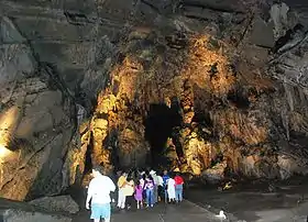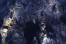 Cacahuamilpa is one of the largest cave systems in the world.[4] It is a "live" cave system, meaning that groundwater still filters down into it, and that the formations there are still growing.[3] Inside the cavern system are ninety large "salons" separated by large natural rock walls and connected to one another via a central gallery.[4] However, only about twenty of these are fully explored and open to the public.[8] Most of these salons are located under the Cerro de la Corona, a limestone mountain ridge.[6] borehole openings.[4] These salons average about forty meters wide,[6] and vary in height from twenty to 81 meters.[2] Most have names which reflect the major formations found in them such as the Goat Salon, the Throne Salon and the Cathedral Salon.[4] All the openings numerous rock formations growing from both the ceiling and the floor.[4][6] One of the drier salons has been dubbed the “Auditorium”. It has a large flat floor and has been outfitted with seats. It is rented out for events,[2] and has been the site for a number of concerts including one in 2007 by Miguel Bosé[9] and one by the Acapulco Philharmonic Orchestra in 2009.[10]