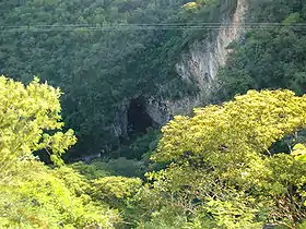 The park has two underground rivers called the Chontalcoatlán, which is eight km long, and the San Jeronimo, which is 12 km long.[4] The tunnels that have been formed by these rivers are still completely active, as the water continues to cut away little by little at the rock.[2] Both have areas with rocks and sandy beaches on each side and the darkness is complete in much of the tunnels’ lengths.[4] The San Jeronimo River has its origins in natural springs that lie in San Pedro Zictepec, Mexico State. The walls of the cavity in which it flows are up to eighty meters high. It is possible for visitors to explore this river, which requires about seven hours to do so; however, it is the easier of the two to explore as it is more level. The waters of the Chontalcoatlán originate from the Nevado de Toluca. Its descent underground has carved out an entrance fifty meters high. It is also possible to visit this natural tunnel although it is necessary to get to the entrance by vehicle. It is relatively easy to travel to a point called La Caraboya or La Ventana. However, after this point, the river descends steeply and those not in good physical condition are not advised to continue.[2] Just after the two rivers reemerge above ground, they join to form the Amacuazac River, which is a tributary of the Balsas River.[2][4]