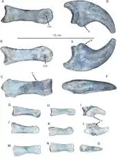 The holotype, MPCN PV 0001, consists of a partial skeleton lacking the skull. It contains four vertebrae of the back, three vertebrae of the middle tail, ribs, a basket of belly-ribs, the left shoulder girdle, the left forelimb, the right lower arm, the lower ends of both pubic bones, the right thighbone, the lower end of the left thighbone, the upper ends of the right shinbone and calf bone, elements of both metatarsi and three toes of the right foot. Most bones were uncovered in their original anatomical position but much of the skeleton had been destroyed by erosion.[1]